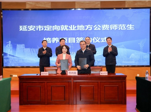 奚家米校长在签约仪式上指出,定向就业地方公费师范生项目既是加强延安市基础教育教师队伍建设,缓解基层学校师资结构性短缺问题的一项重要民生举措,也是高校服务地方教育事业发展、培养优秀教育人才的重要途径。延安大学根植于红色沃土延安,服务老区、奉献老区经济社会高质量发展是学校的天然使命和责任担当。学校将深入贯彻落实习近平总书记重要批示指示精神,紧扣立德树人根本任务,在省委教育工委、省教育厅和延安市委市政府的指导下,大力弘扬教育家精神,完善延安精神铸魂育人体系,深化“五育并举”“三全育人”举措,构建协同育人机制,高质量完成定向就业地方公费师范生的培养任务,努力培养造就一批具有延安精神特质、堪当民族复兴重任的新时代大国良师,为基础教育事业发展、革命老区振兴,为助力地方经济社会高质量发展作出延安大学新的贡献。