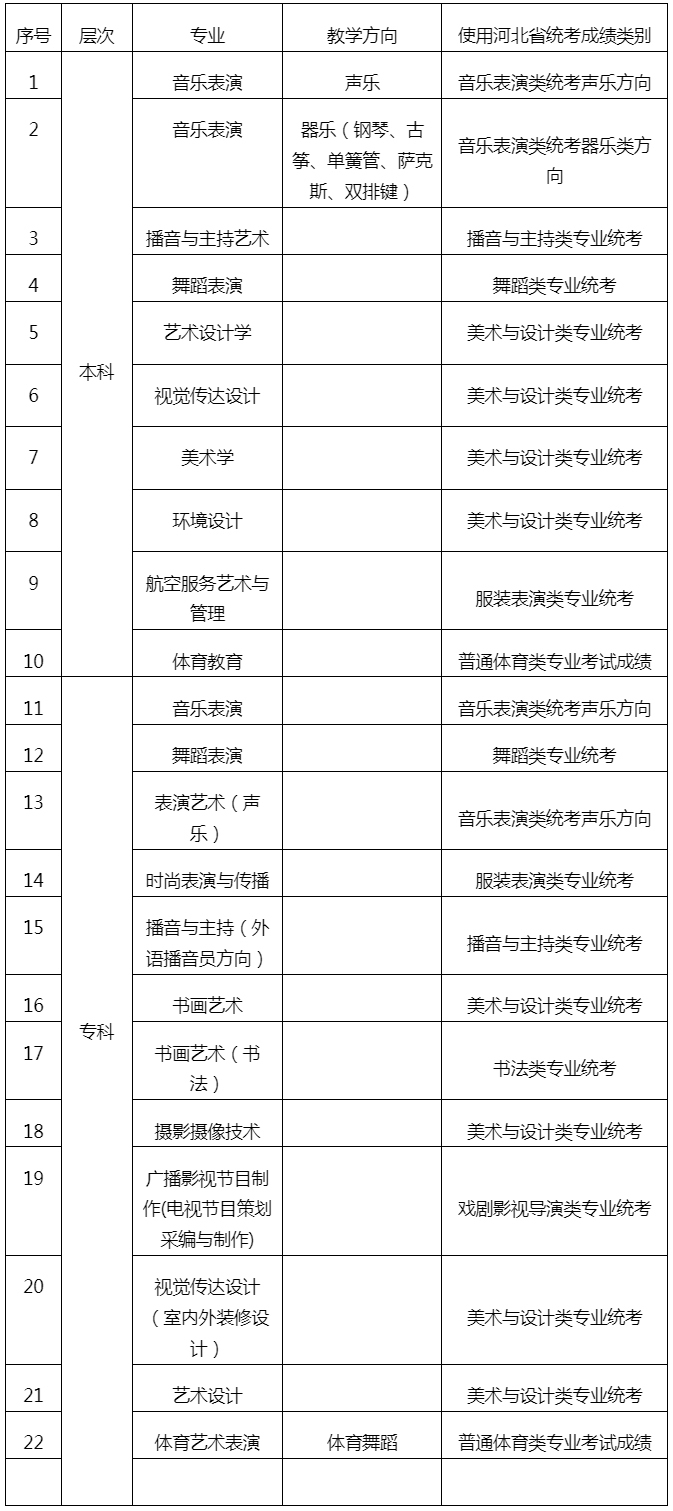 学校艺术类本科音乐表演、舞蹈表演、播音与主持艺术、艺术设计学、美术学、视觉传达设计、环境设计、航空服务艺术与管理专业和专科音乐表演、舞蹈表演、表演艺术(声乐)、时尚表演与传播、书画艺术、书画艺术(书法)、摄影摄像技术、广播影视节目制作、视觉传达设计(室内外装修设计)、艺术设计、播音与主持(外语播音员方向)专业在河北省以外的省份录取时:我校认可各省相关艺术类专业统考(联考、校际联考)成绩,并认可各省投档规则,在已投档范围内,按照“分数优先、遵循志愿”的原则,依据专业成绩依次录取。对进档考生同等分数情况下,按高考文化总成绩(含政策性加分)、语、数、外顺序比较单科成绩,优先录取分数高的考生。